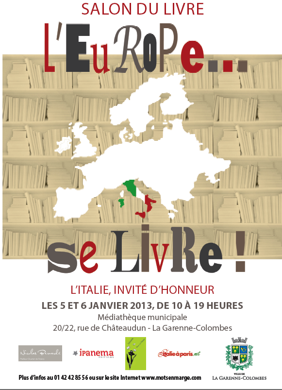 Nous sommes heureux de vous convier à la première édition du salon du livre L’Europe… Se livre, à La Garenne-Colombes, dont cette année l’Italie est l’invitée d’honneur. Nous sommes naturellement partenaires de cette initiative culturelle, organisée par la libraire Mots en marge de La Garenne-Colombes et les Éditions Ipanema. Au programme : Expositions, débats, tables rondes, séances de signature…
